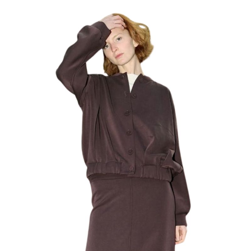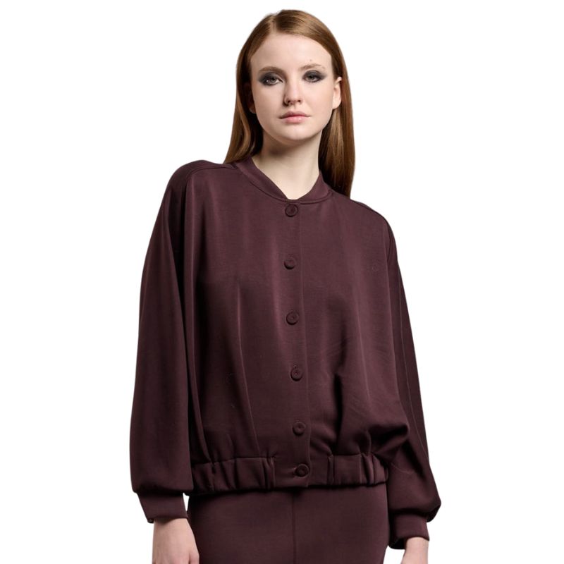 Cazadora corta en color berenjena, cuello redondo y manga larga. Altura a la cadera y elástico ancho. Cierre con botones de tela en el mismo tejido suave. Cuello redondo. Con bolsillos