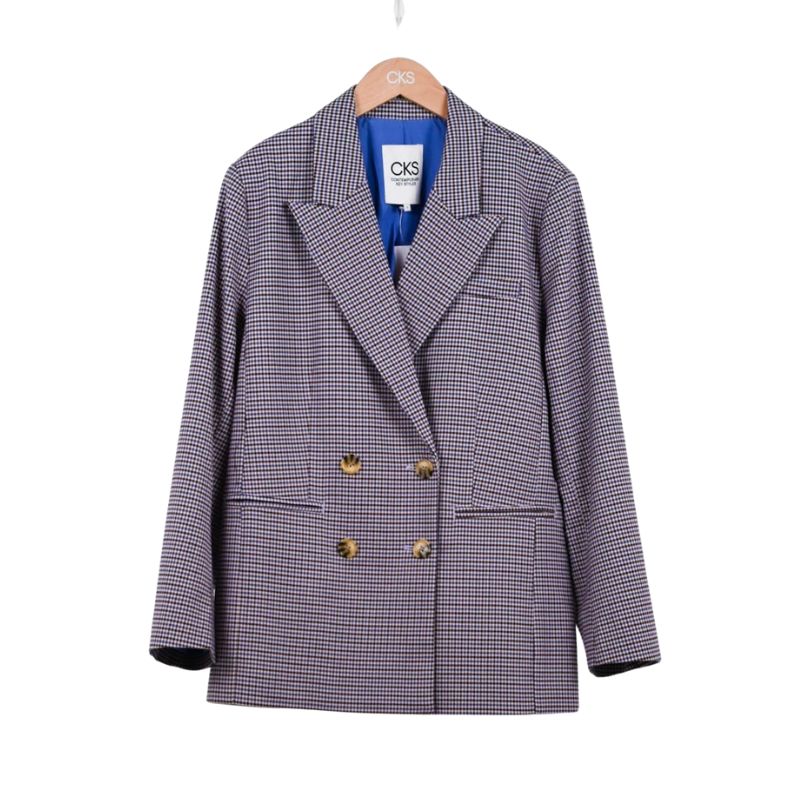 Este blazer de cuadros de CKS es una prenda icónica que aporta elegancia y modernidad a cualquier look. Confeccionado en un tejido estructurado con patrón de cuadros mini en tonos azul, beige y burdeos, combina el estilo clásico británico con el aire contemporáneo característico de la marca belga.