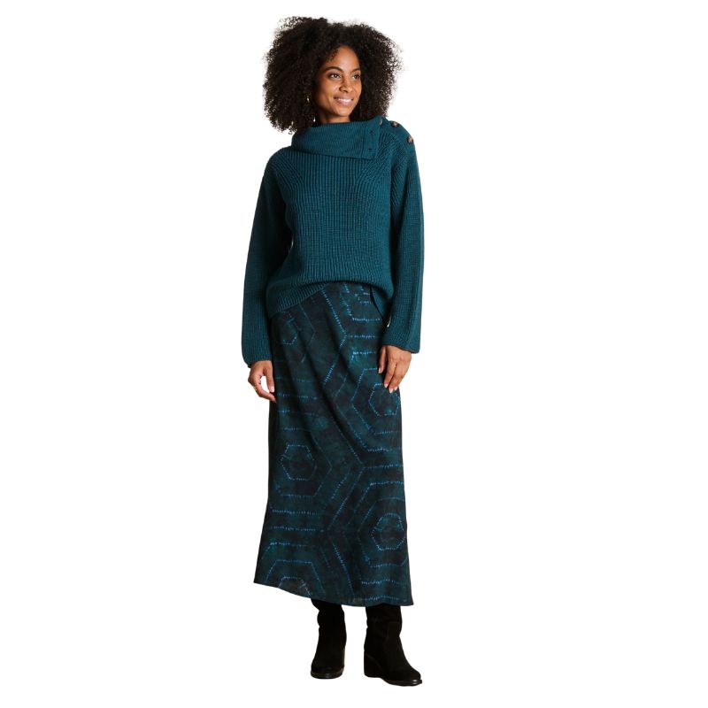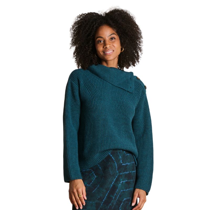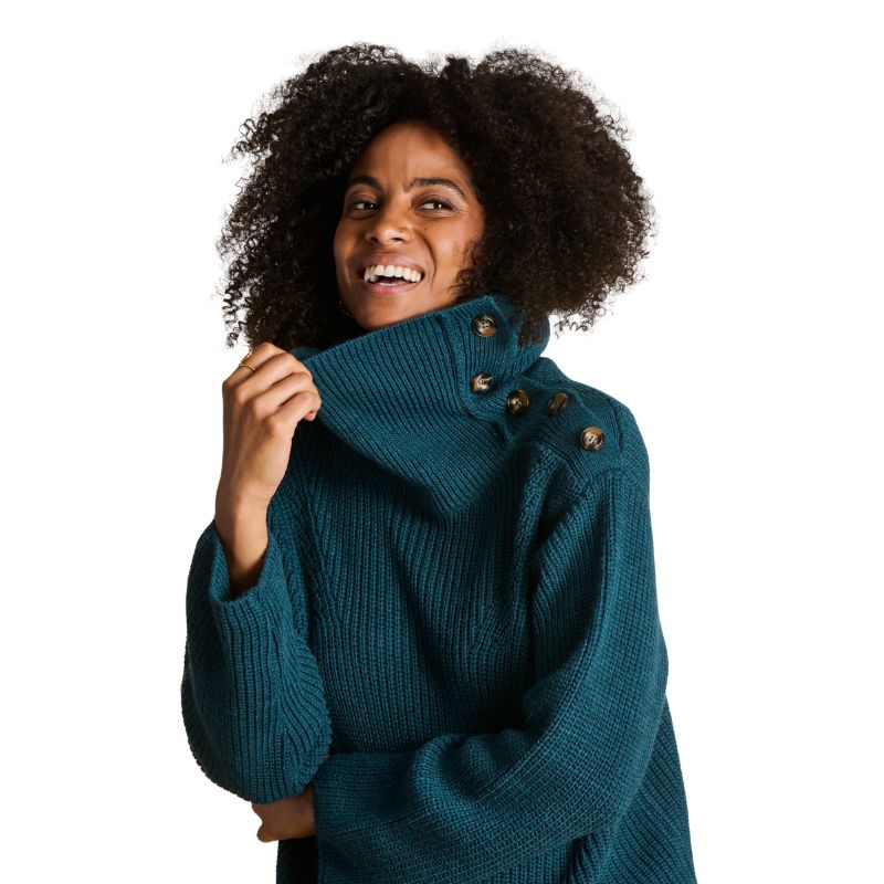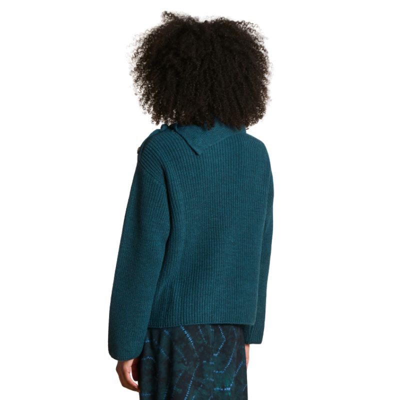Jersey petroleo de lana con cuello alto abierto y botones decorativos, largo a la cadera.