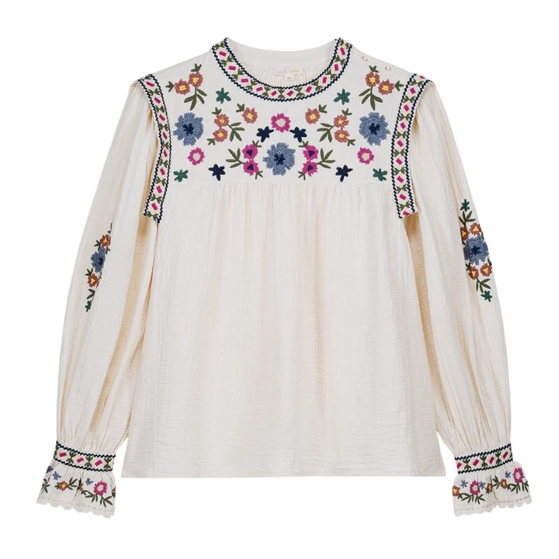 Con mangas largas abullonadas terminadas en un delicado puño bordado y cuello redondo con detalles florales, esta prenda se convierte en una pieza versátil y única para tu armario. Ideal para combinar tanto con vaqueros como con faldas, aportando un toque femenino y atemporal a cualquier look.