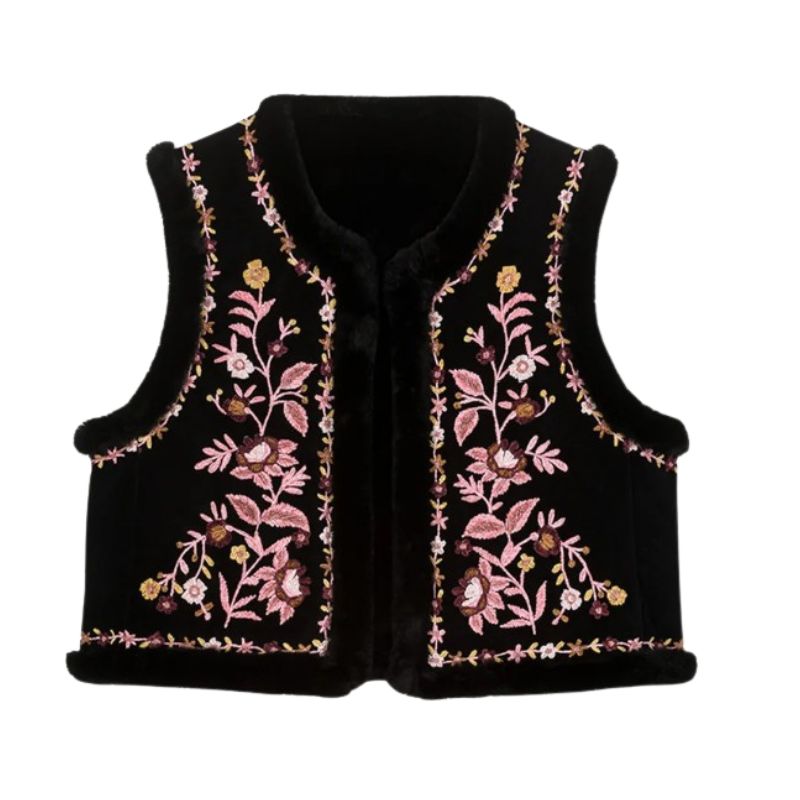 Chaleco corto, reversible de pelo negro por un lado y de antelina con flores bordada por otro.