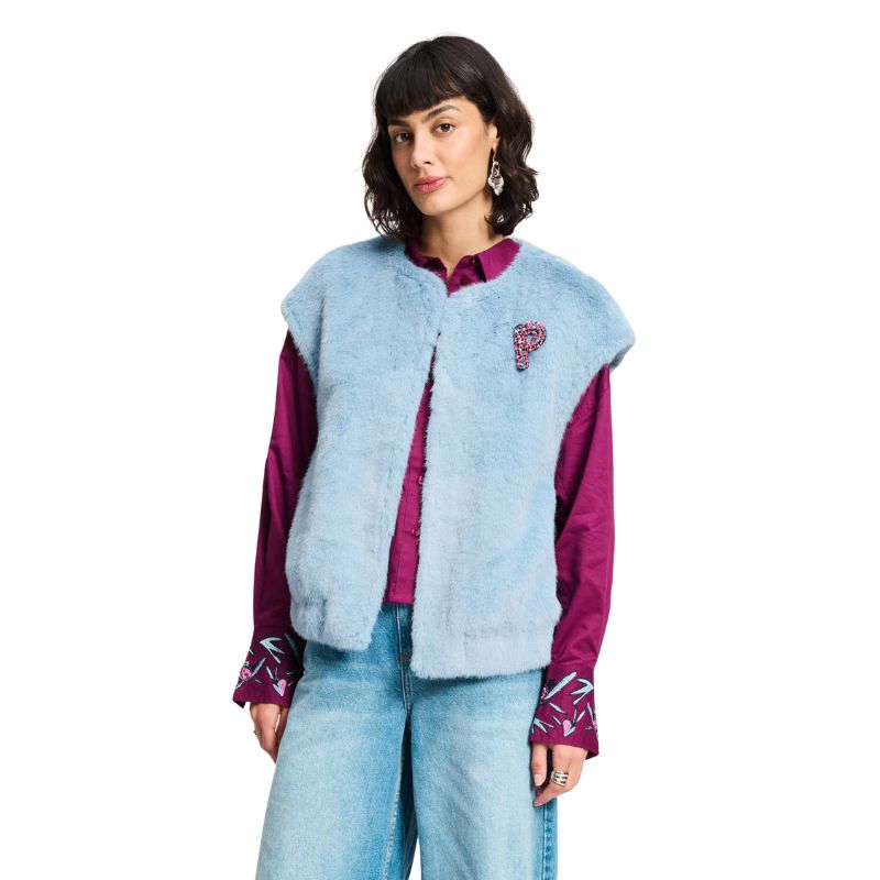 Chaleco de pelo en azul con un broche de P de pedrería en la parte superior izquierda (va con un imperdible. Altura a la cintura.