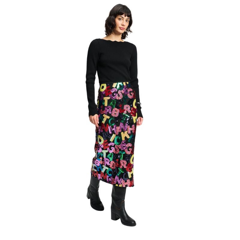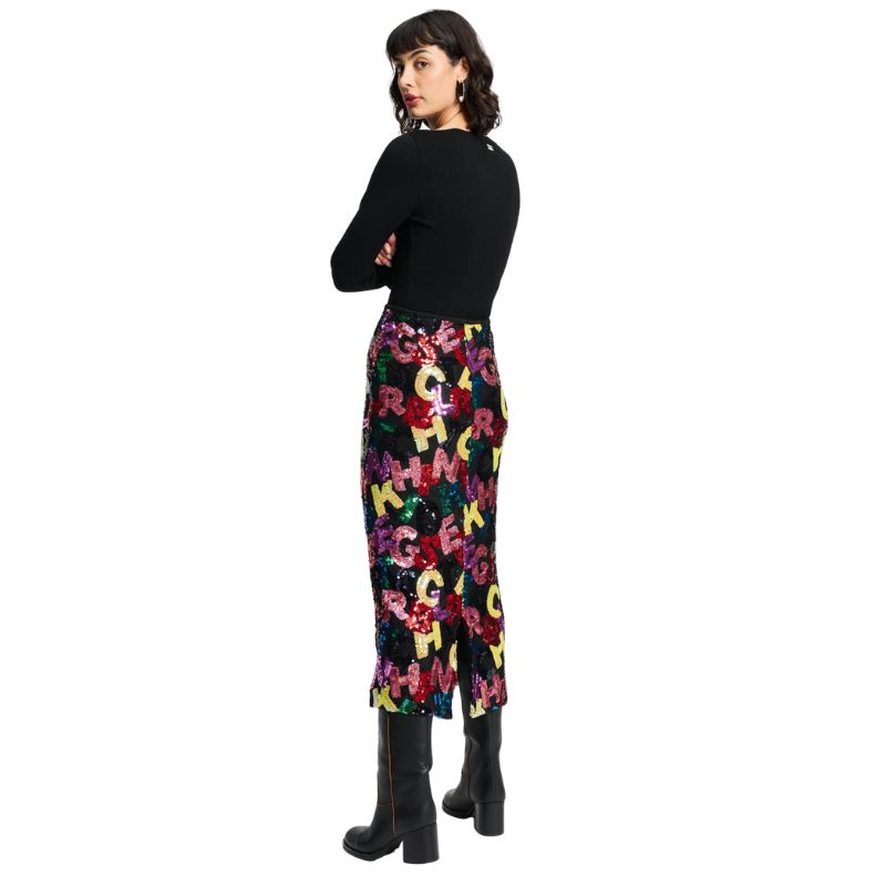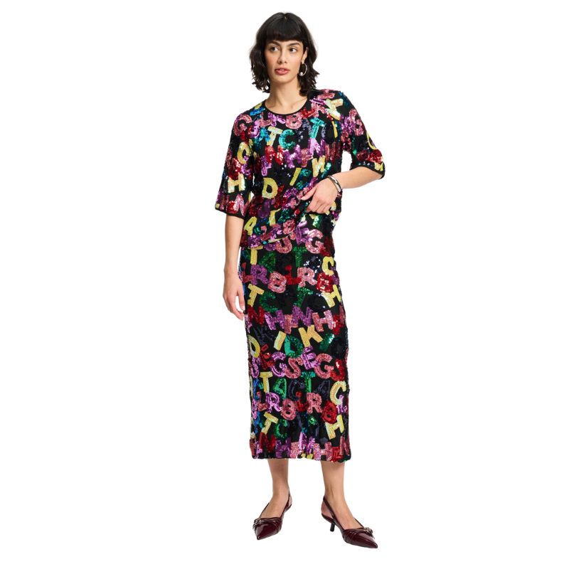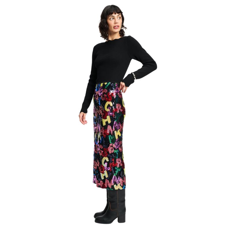 Deslumbra con la falda midi de lentejuelas multicolor con letras —una prenda única que combina arte, brillo y moda contemporánea. Confeccionada sobre una base negra, esta falda está decorada con letras bordadas en lentejuelas de colores vibrantes que aportan dinamismo y originalidad a cualquier look.