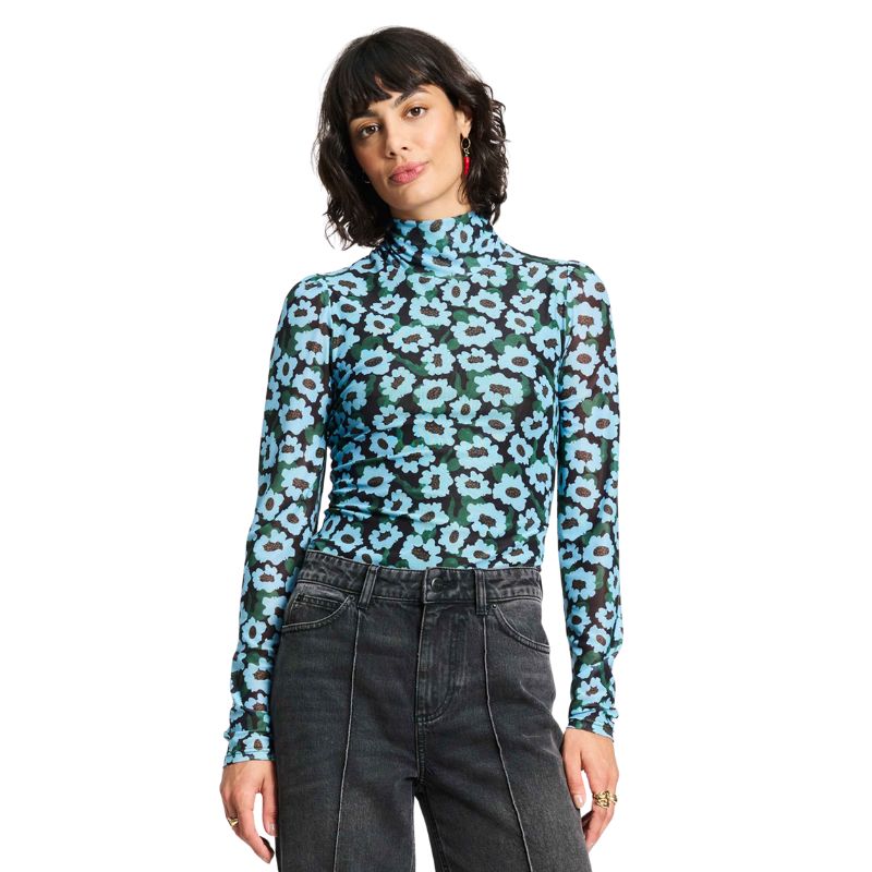 Camiseta de manga larga y cuello alto, tejido de malla con estampado de flores azules. largo a la cadera. Completa el look con el chaleco de pelo azul y los pantalones del mismo estampado.