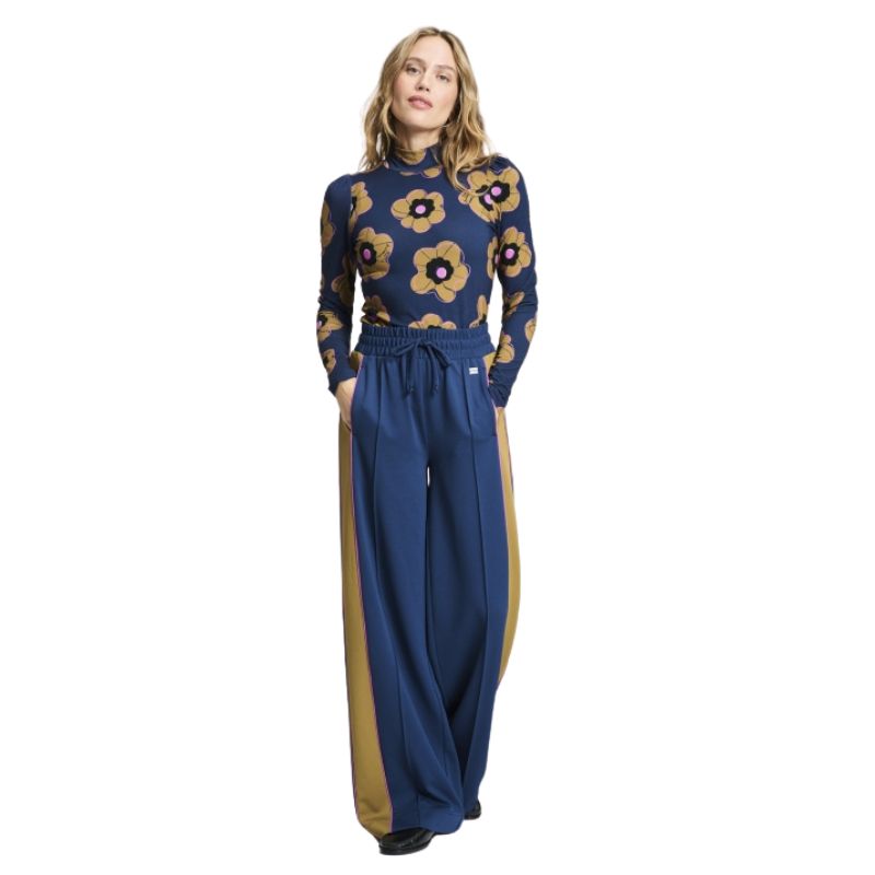 Pantalón con goma a la cintura con bolsillos, y raya lateral en marrón con dos rayas finas en rosa. Ideal para un look cómodo y para combinar con la camisa de croisants.