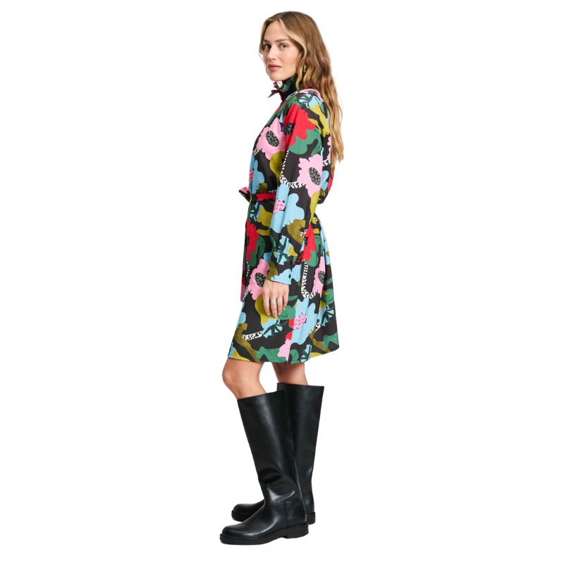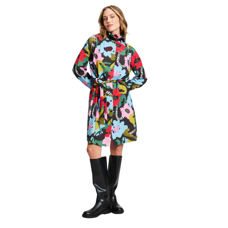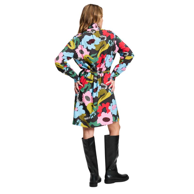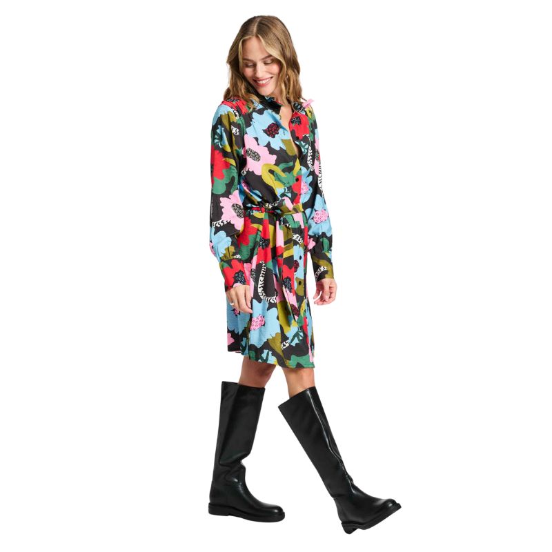 Vestido camisero con estampado de flores con cuello mao fruncido, manga larga y puño. Largo a la rodilla, se puede vestir suelo o con cinturón.