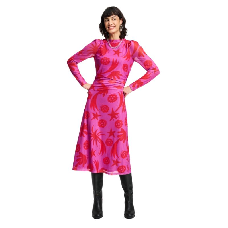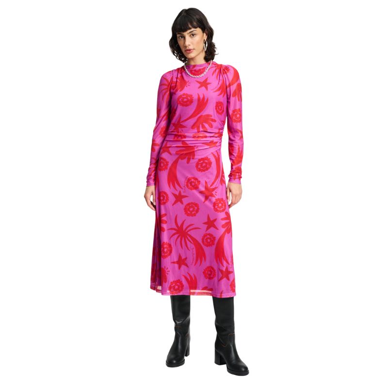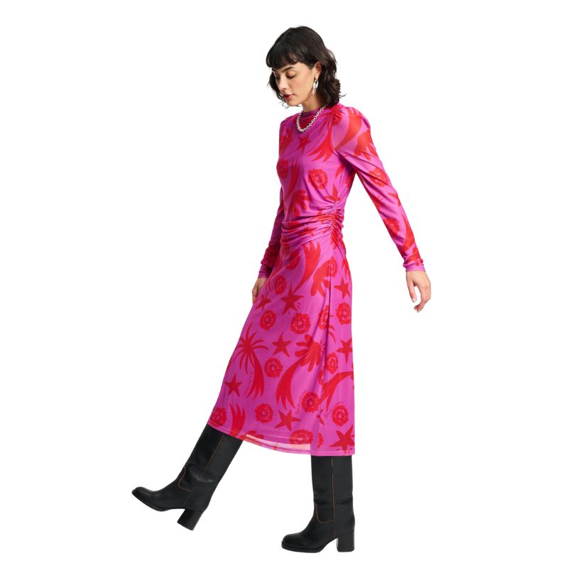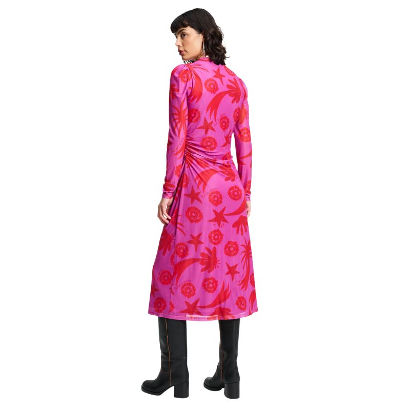 Aporta un toque de energía y color a tu armario con este vestido midi elástico en tonos fucsia y rojo, una prenda que combina estilo, comodidad y personalidad. Su estampado geométrico con motivos abstractos crea un efecto visual único, ideal para mujeres seguras de sí mismas que buscan destacar sin renunciar al confort.