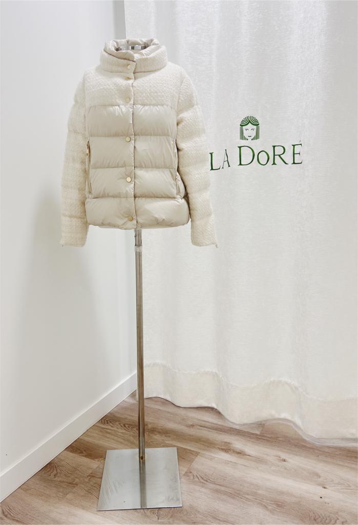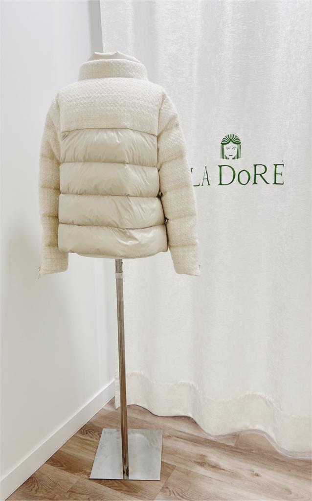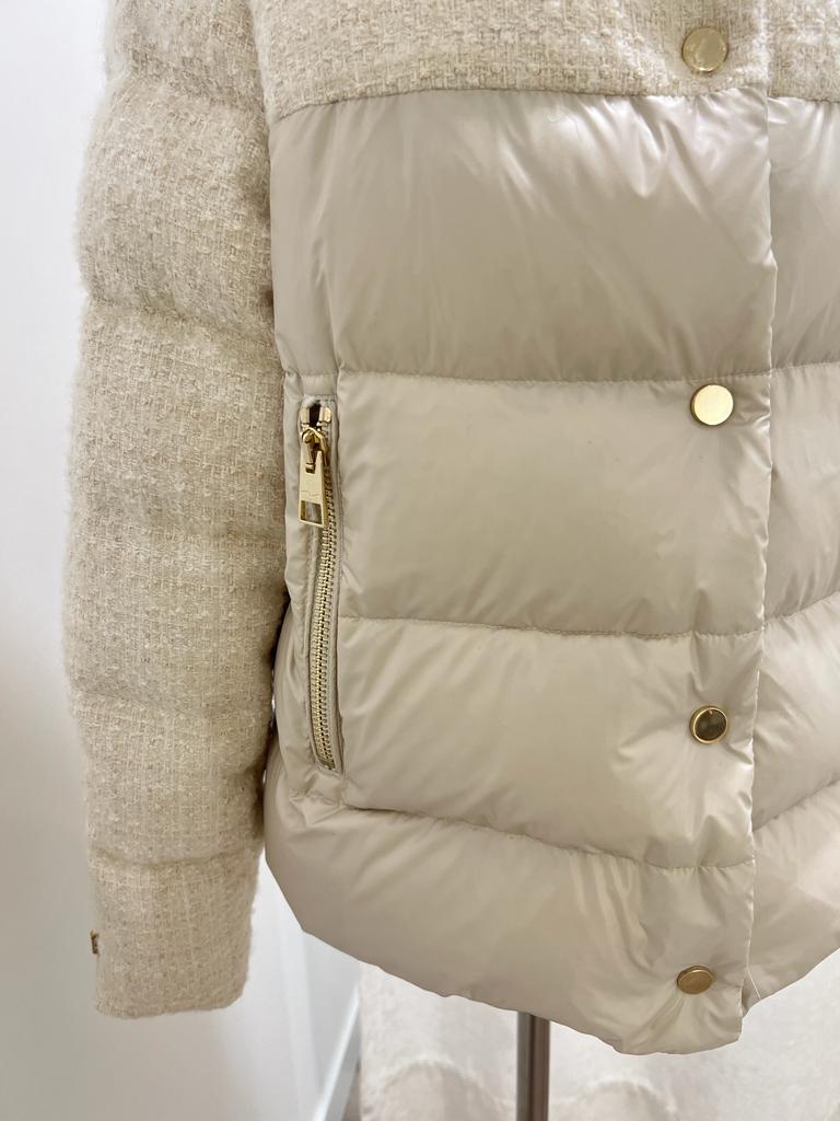 Cazadora de plumas corto en color beige, mangas y el tercio superior del pecho y la espalda en tejido chanel en color beige y los otros dos tercios del torso en tejido plumífero. Con detalle de cremallera dorada en la manga, dos bolsillos con cremallera dorada y con botones dorados para cerrarla. Con original doble cuello con los dos tejidos